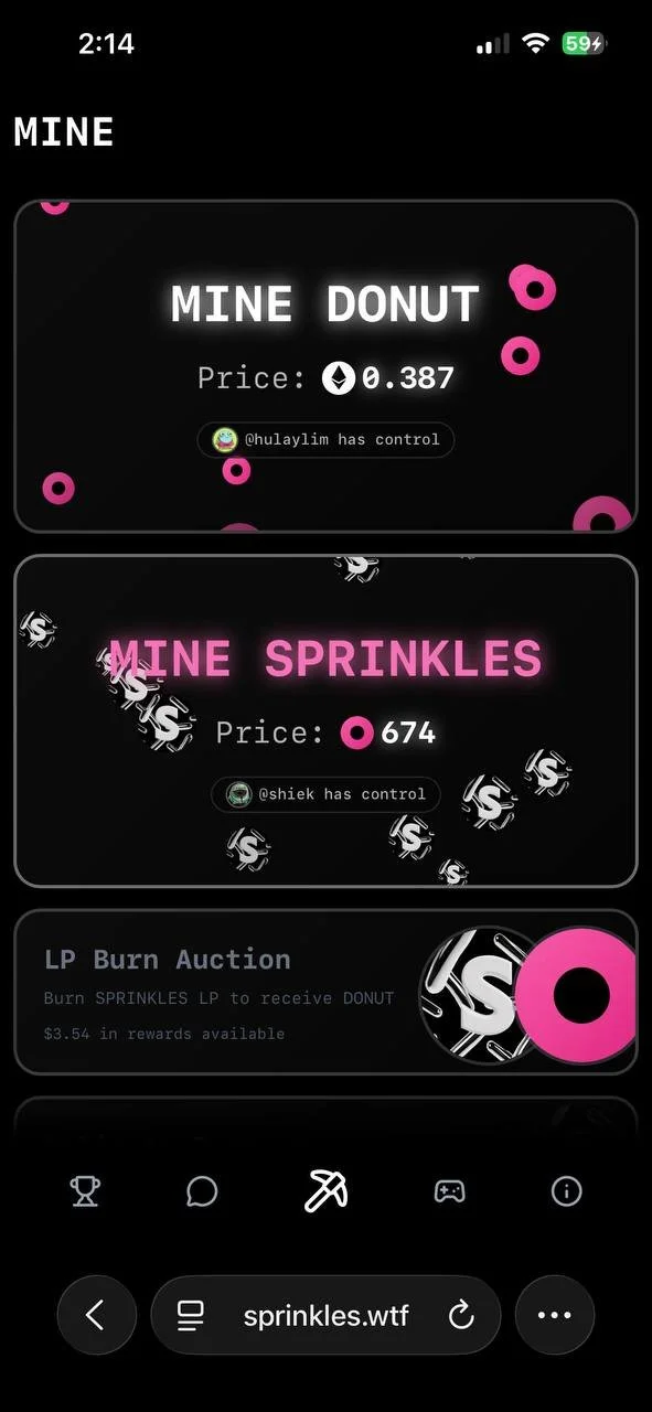 Play arcade games, mine tokens, and chat to earn DONUT, SPRINKLES, and USDC rewards every week!